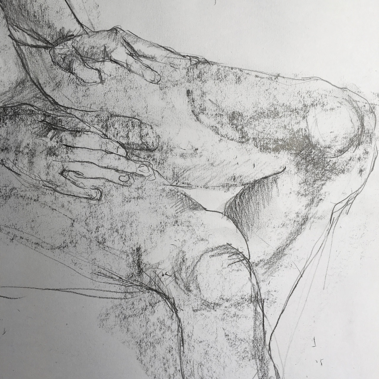 Final pose was a 40mins seated pose. I switched to graphite bar and pencil. Tried to be free in my drawing and mark making. In places this was very successful but I think there is something unresolved about the relationship between the body and the legs. Happy with this piece as two separate photos (above) rather than as a whole. Pleased with the hands in this drawing.