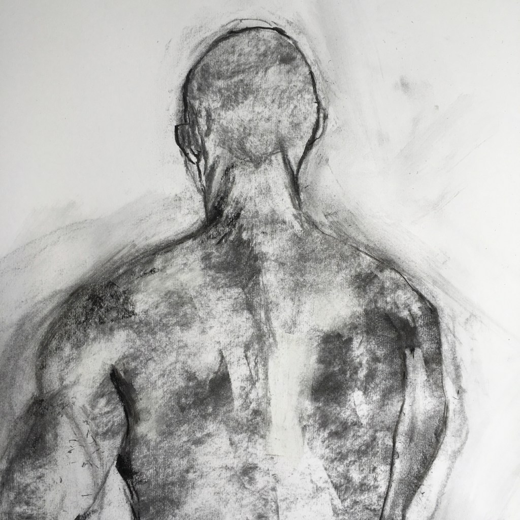First pose was for 10 mins – a full frontal standing pose. Working in charcoal I decided to really concentrate my looking at the upper body and arm relationship – which I think I captured well. We then had a three min dancing pose. It took me about a min to relax into this – the result looks nothing like a figure but I can see/feel the models dancing arms. I choose to draw long the outline of the body changing the line as the body changed. Would have quite liked more poses like this. We then had a seated 20 min pose – of the back of the model. Struggled to find definition in the back – but pleased with the head/neck relationship.