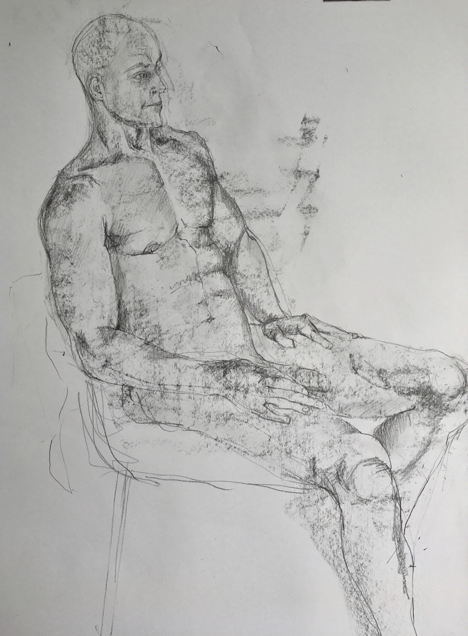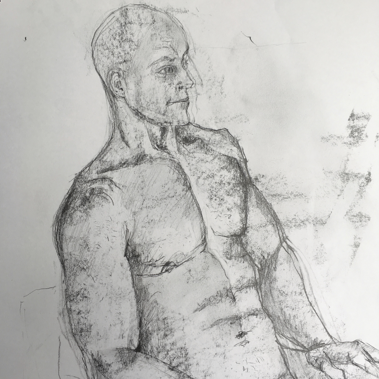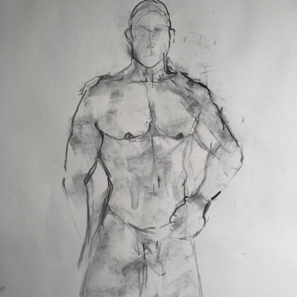 This Friday session saw another new model. I am not sure I have ever drawn someone so muscular – so it was quite a challenge. I was on a reduced art kit (due to a heading straight off to lunch afterwards) so worked in charcoal and graphite on paper bought at the session.
