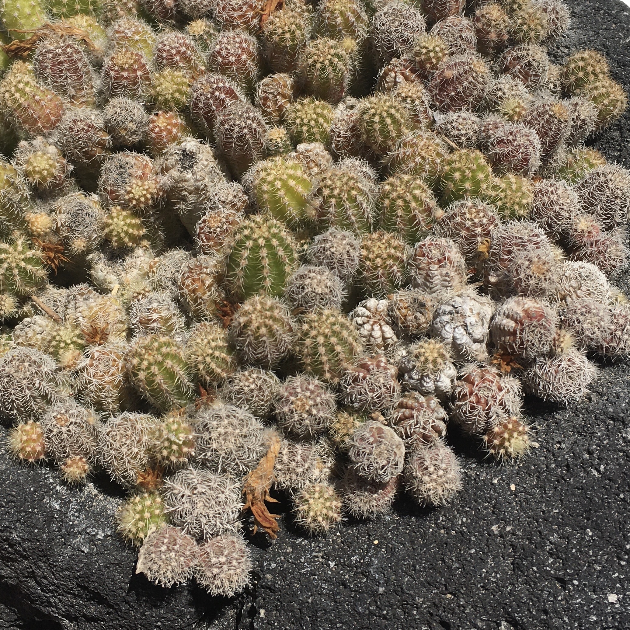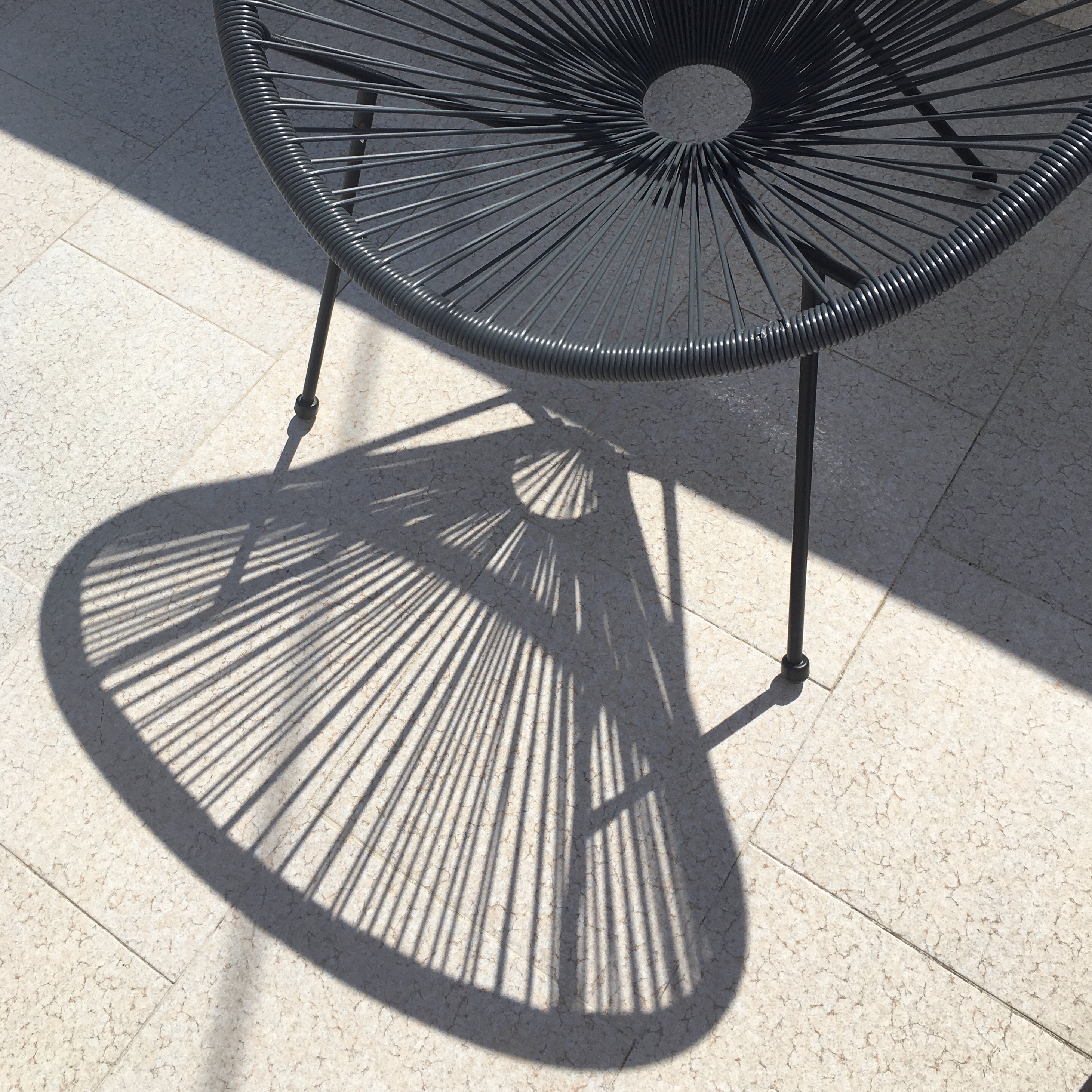 Today: View from bedroom window: Chair and shadow on balcony: sunlight: Cactus in a pumice stone pot.