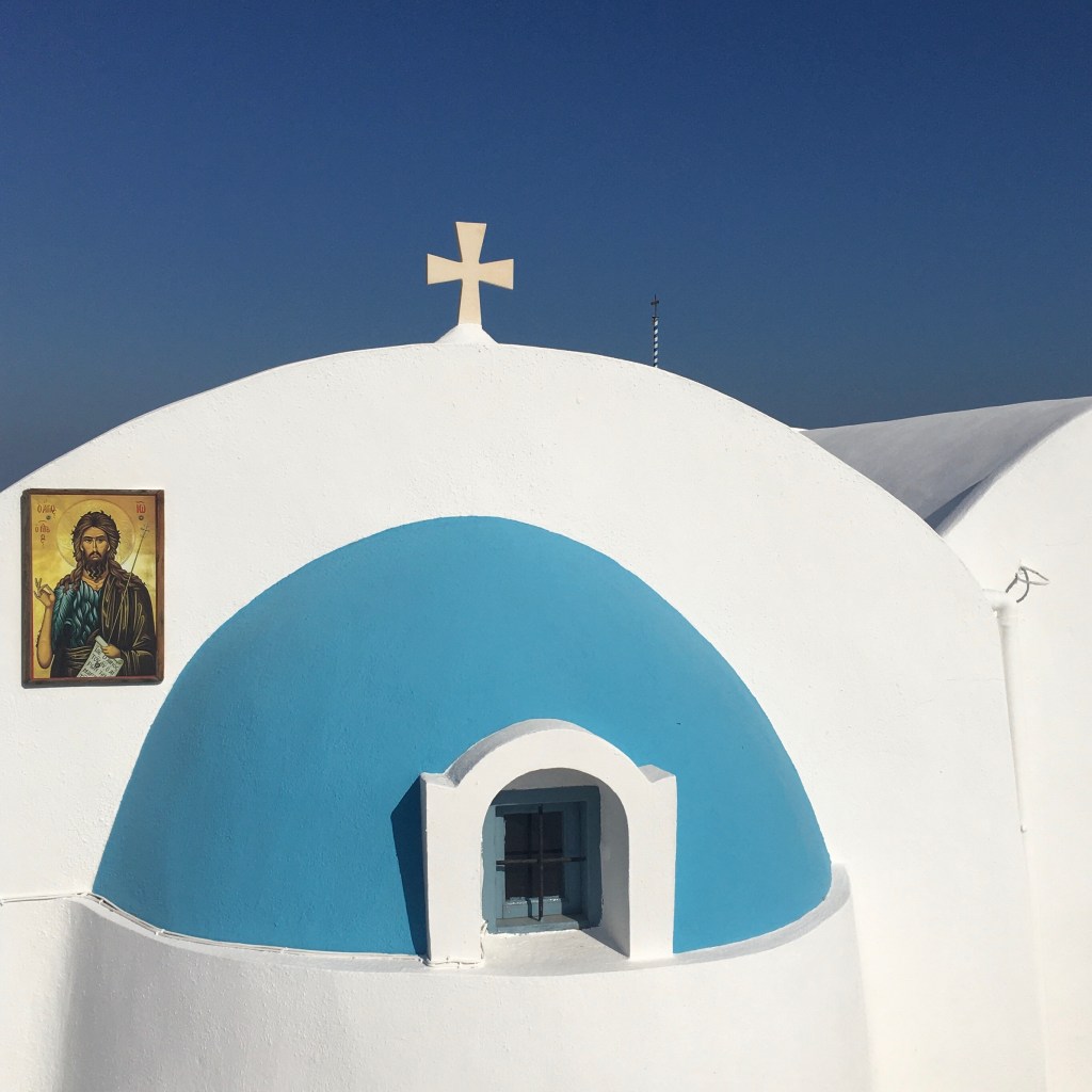 Today: A chapel on the walk to Akrotiri: sunset reflections in taverna windows: Table cloth