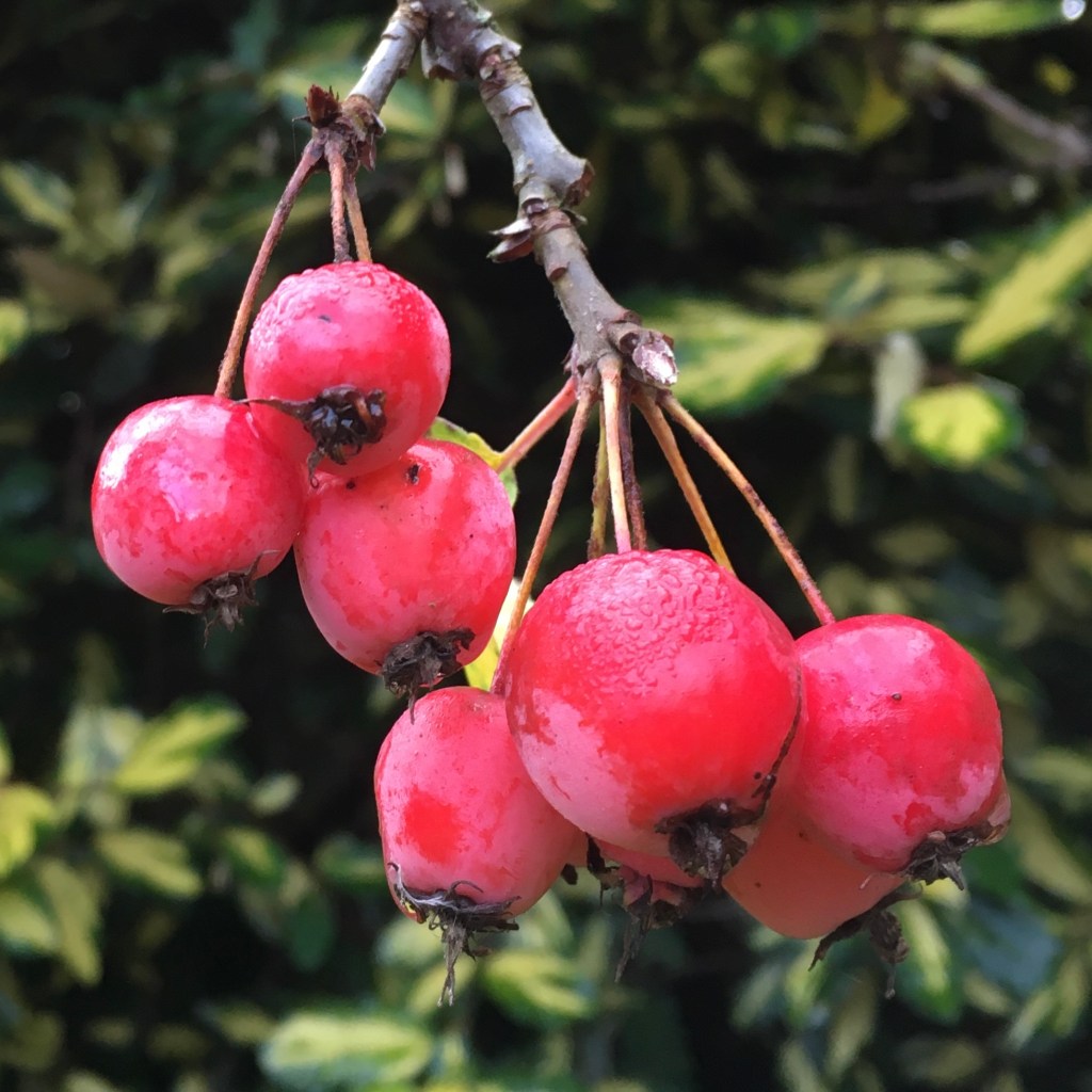 Rudely, since not forecast, it rained heavily during the morning. Cleared into a sun dazzlingly, clear lighted afternoon. Noticing berries and droplets of water on leaves.