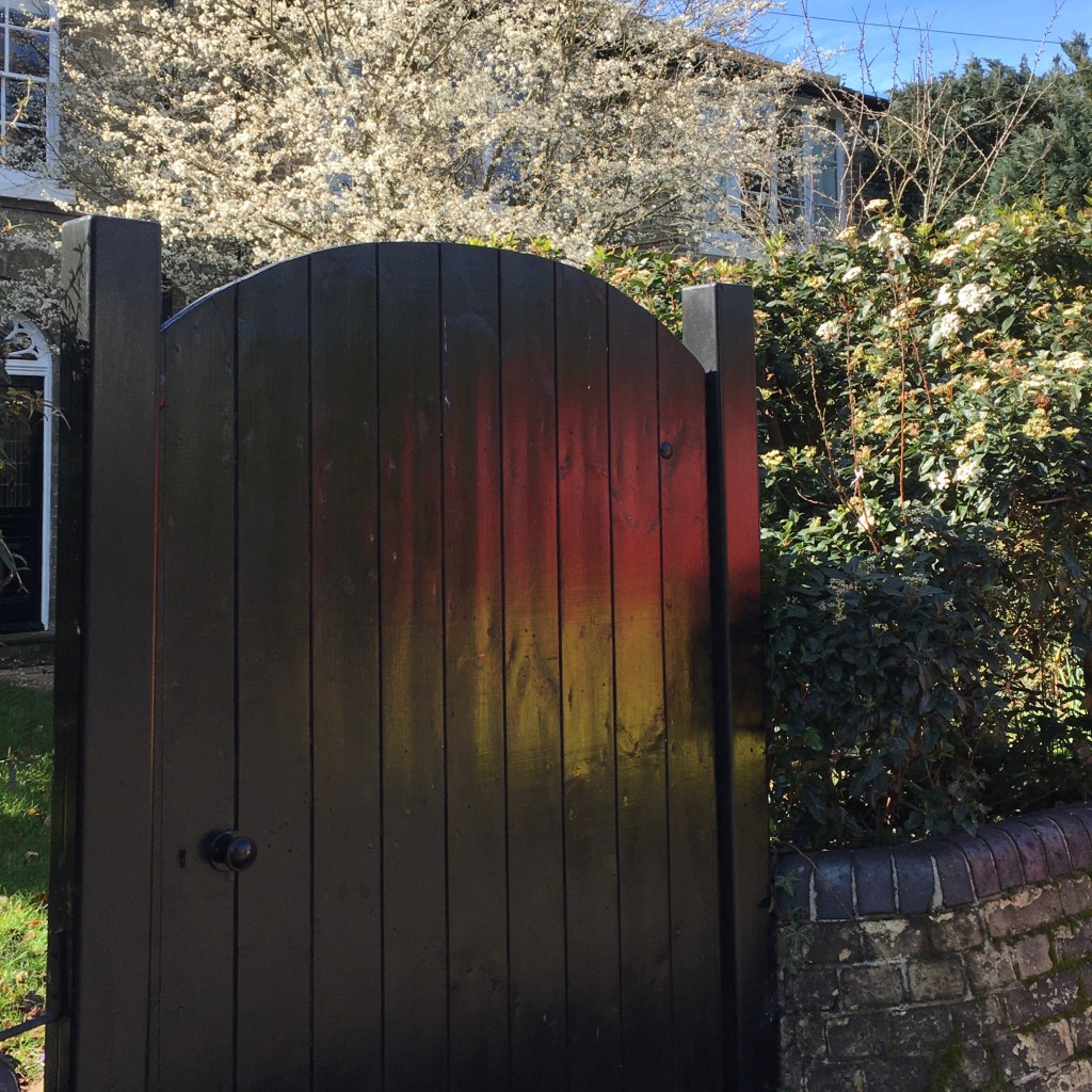 Today: Colourful blooms and the van reflection in the black gate of 43 Mount Pleasantly