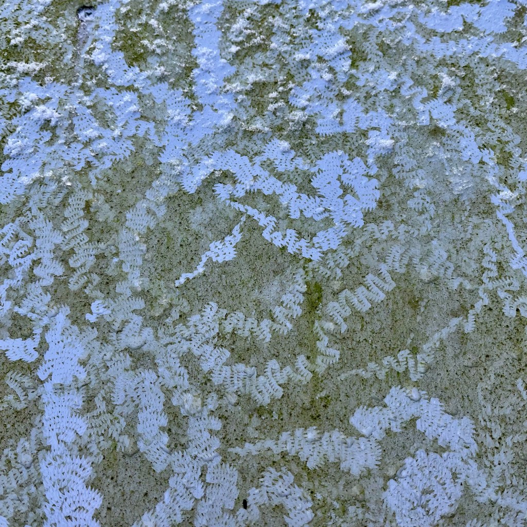 Today: small blossoms, Newmarket Rd: slug (?) trails, roof in Mount Pleasant: snow !!: defrosting the van, delivery office car park