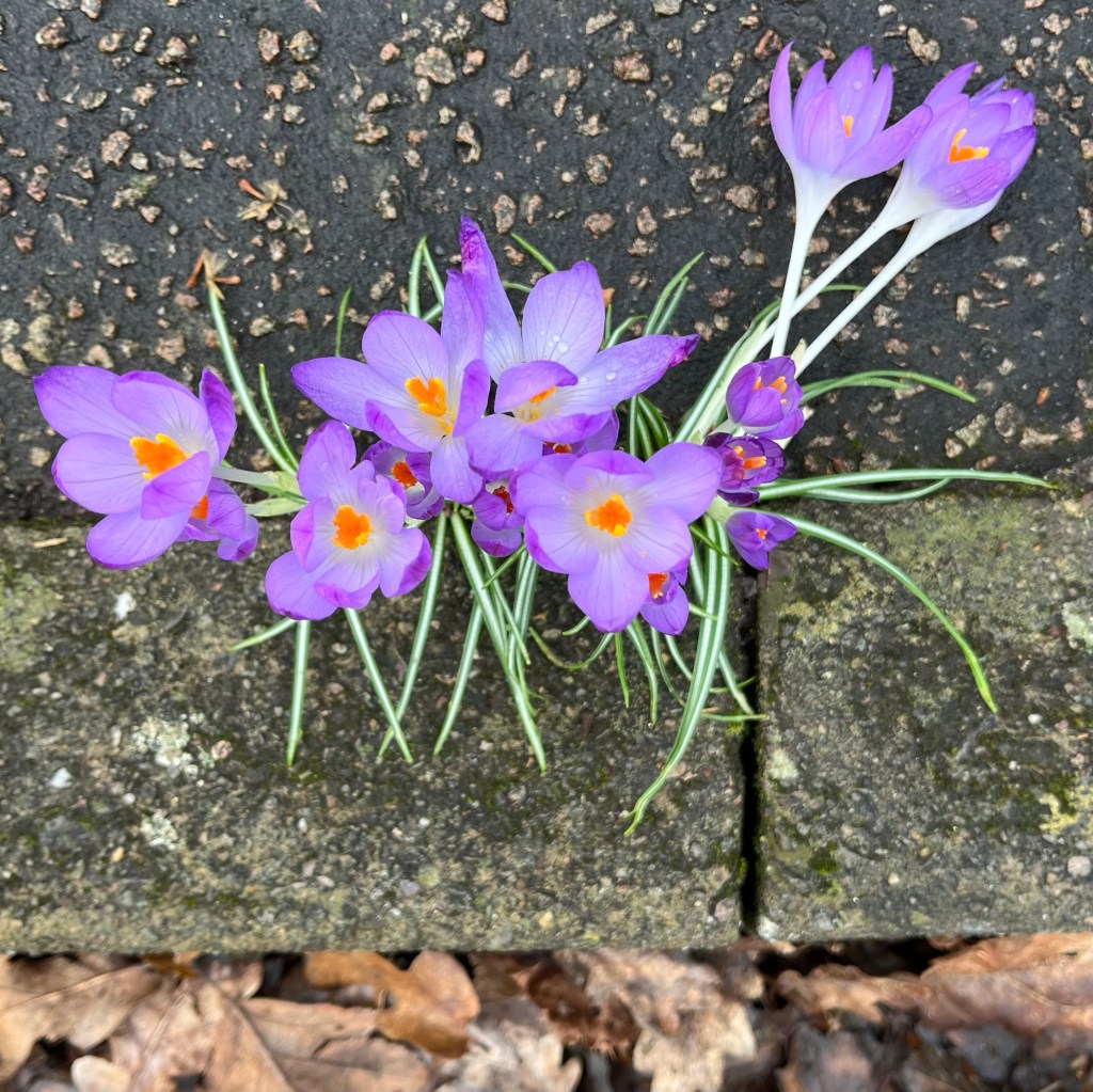 Today: Crocuses: Japonica blossom, Mount Pleasant: Puddle reflection, Wessex Street: My heart has a particular soft spot for plants that thrive in difficult locations, here a splendid crocus at the edge of the pavement, Plantsman Road.
