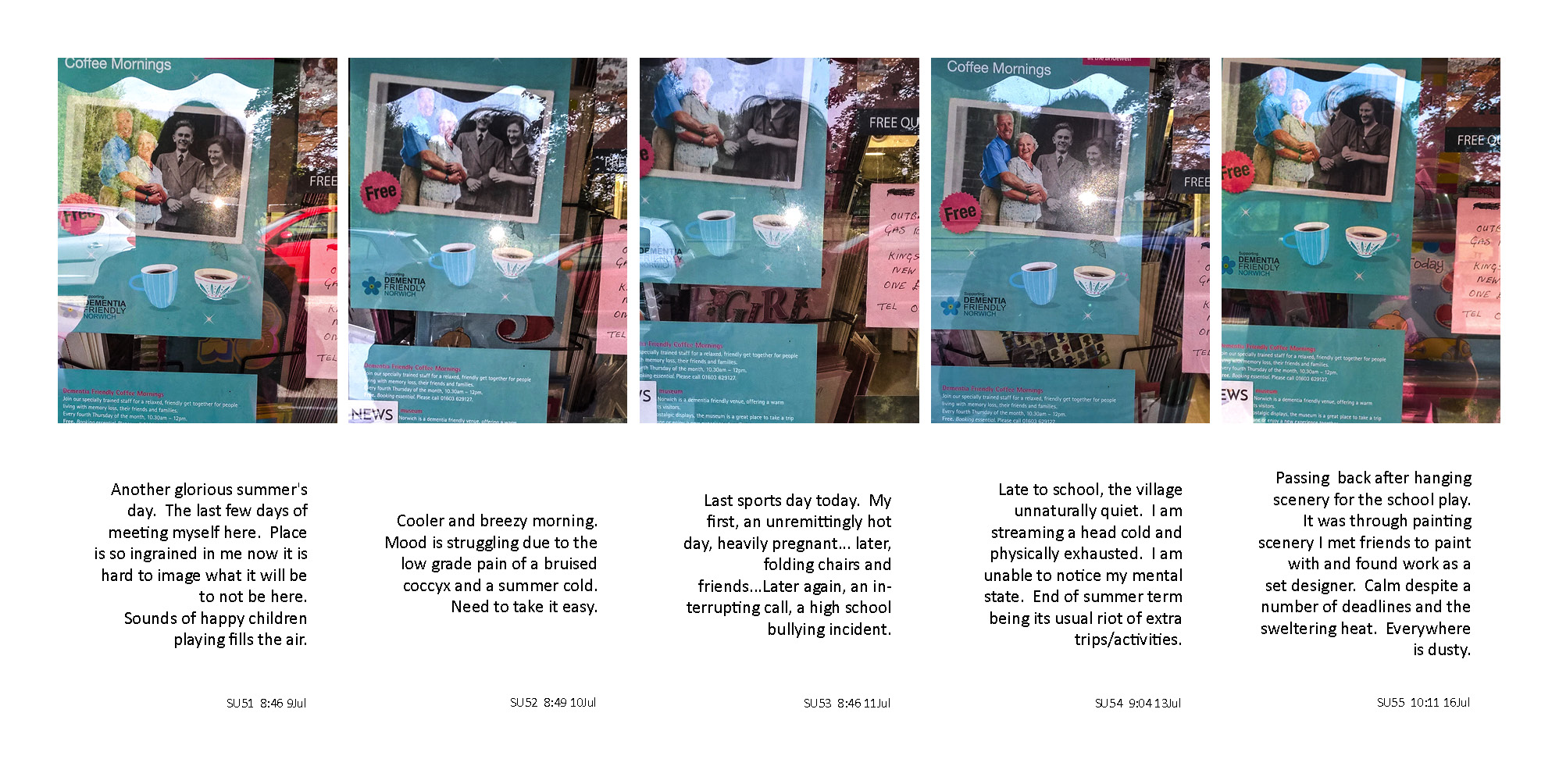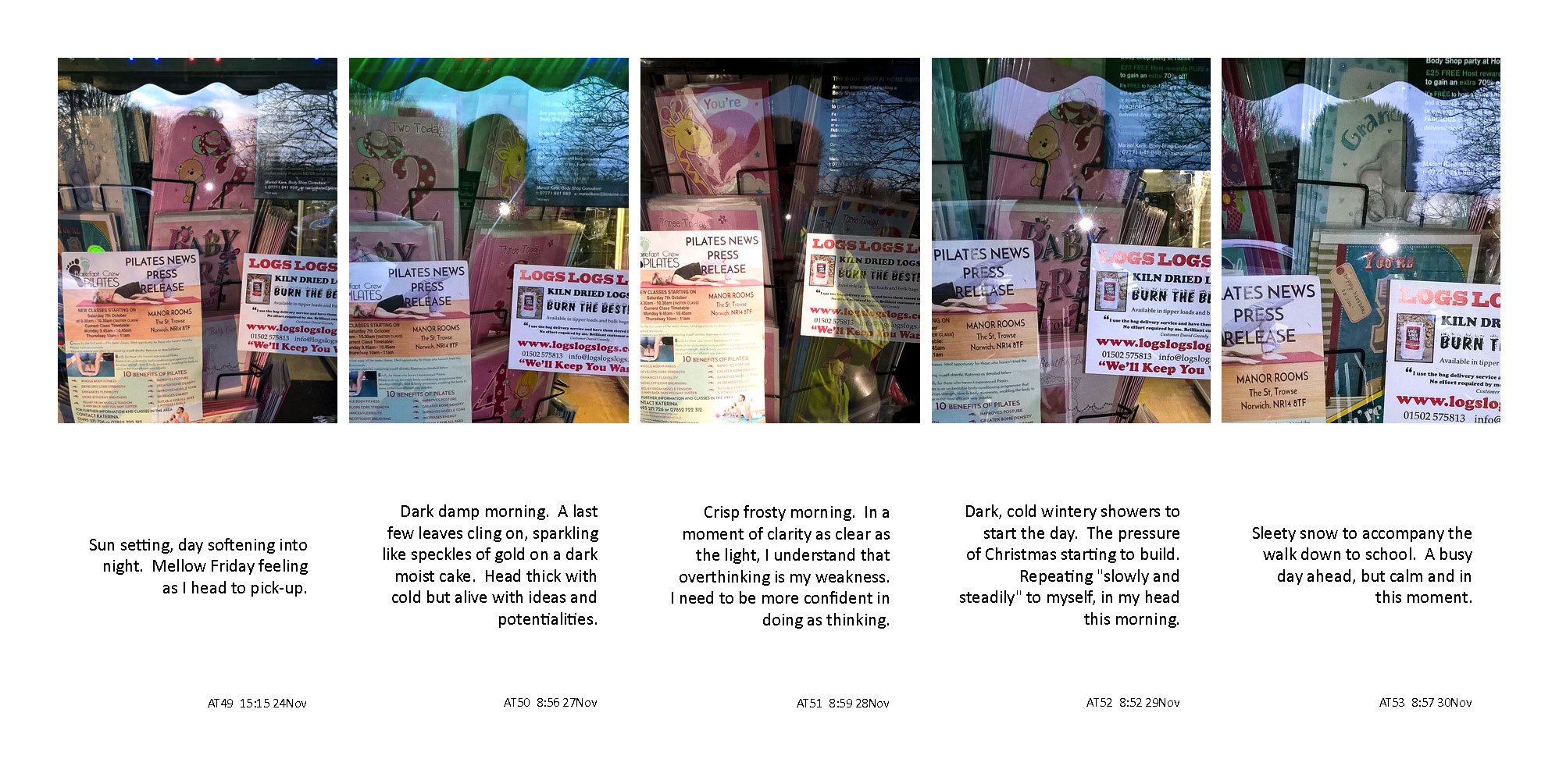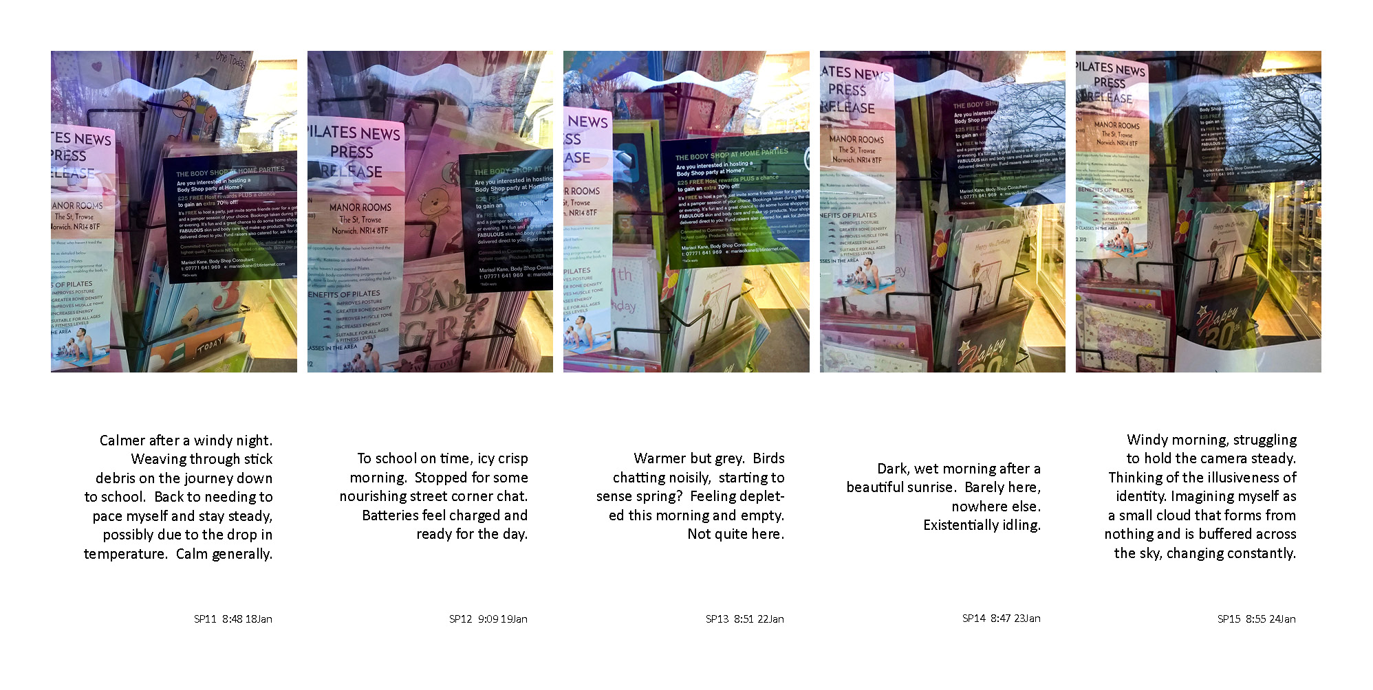 This project was based on the taking of a self-reflection photograph each morning, in a village shop window as it was passed on the way to dropping a child at primary school. It tracked the final year, of fifteen, of making this daily journey to deliver children to school. Alongside the self-reflection photograph, a brief mood description was written.