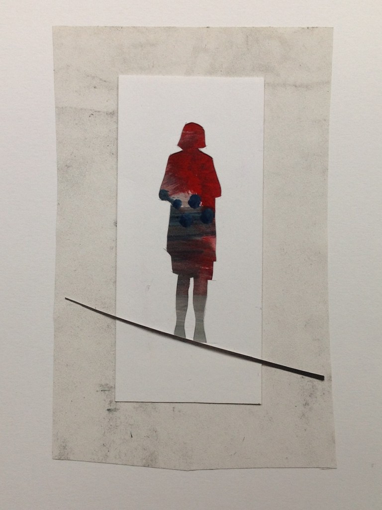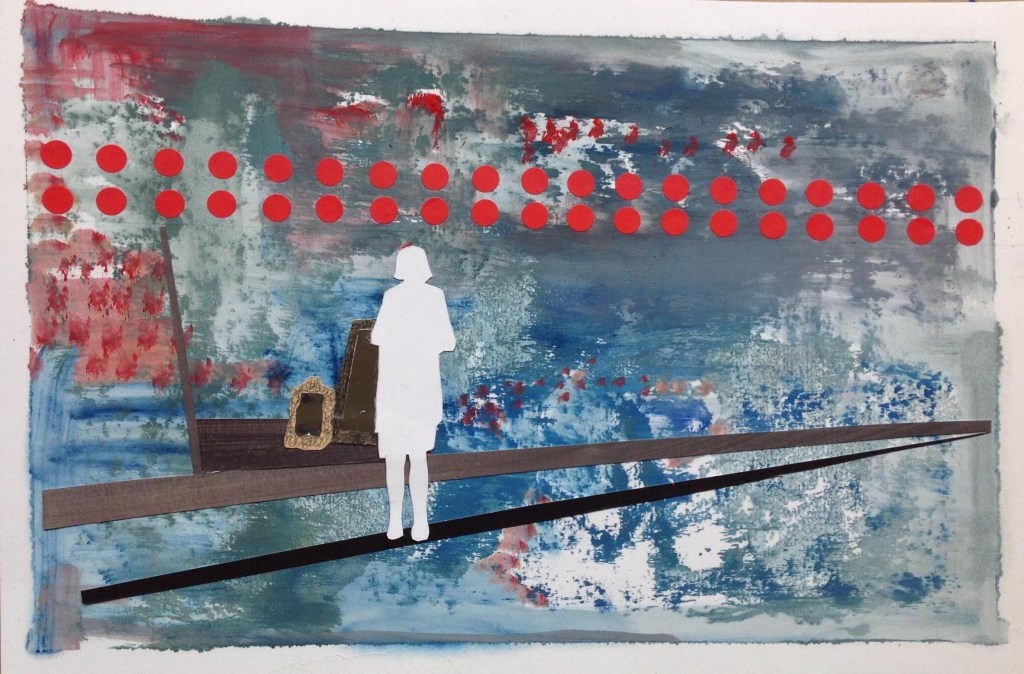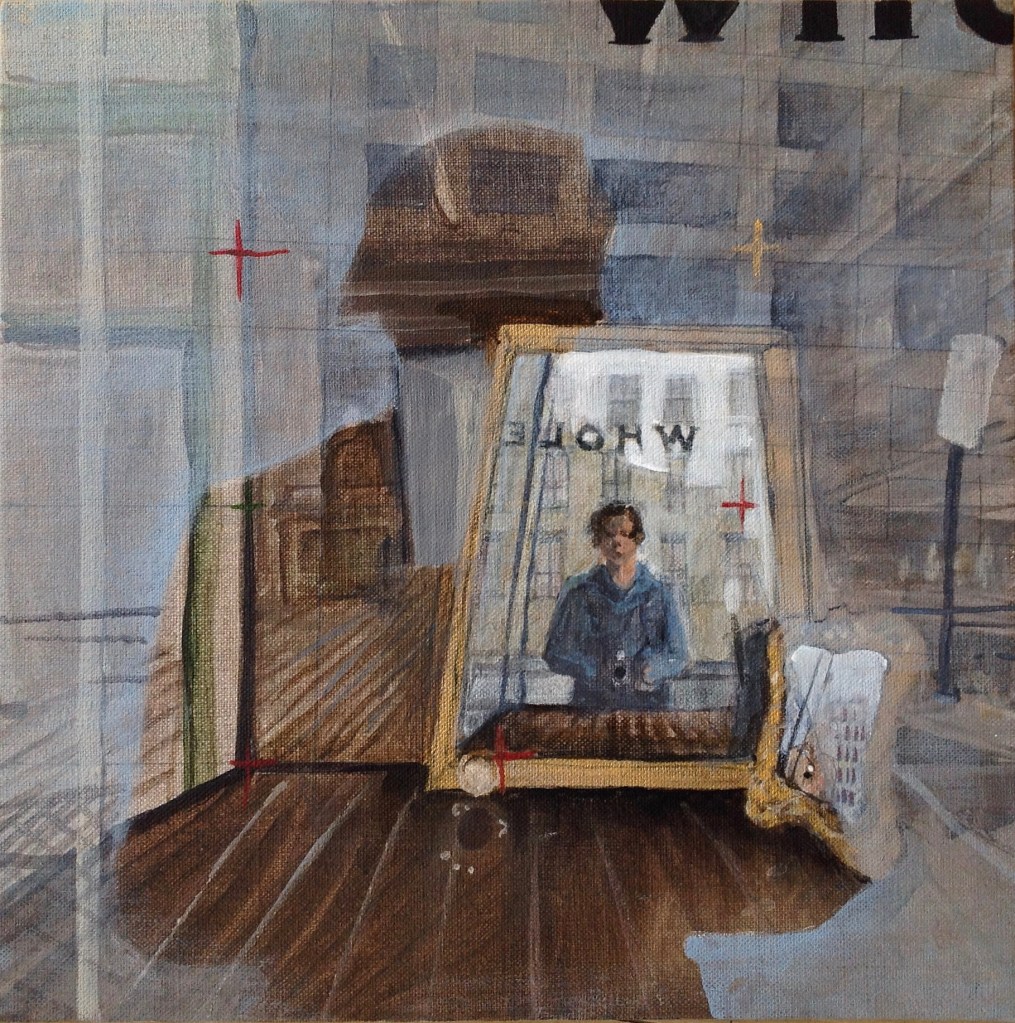 During my MA I discovered the work of American Street photographer Vivian Maier. I was struck by the similarities between her self-portraits in shadow and reflection and the self-portraits I had been taking for a number of years. We seem to share a love of photographing ourselves looking, perhaps sharing a need to see ourselves belonging to a wider world . In this exploratory series of paintings and collages I used elements from her photographs to try to represent the taking of a self-portraits from three positions: Interiority – the desire to capture a representation of self that one can refer to in the future; Connection – the moment of making the image in the present when interior and exterior become one; and Exteriority – the way the moment looks when looking from the outside and from the past.