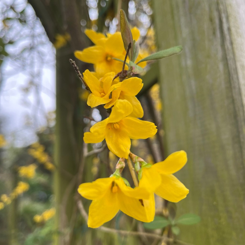 Finally the rain stopped, a dryish but cold day, fingers are split and sore. Still overcast. Noticing flowers, mini Irises, this Wonkeresk bush at 10 Lime tree Rd and new growth leaves.