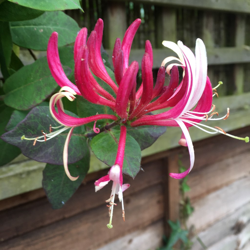Noticing plants connected to my childhood today, when I was young I had a bedroom with a honeysuckle outside. The room was on the ground floor of the house and everyone else slept upstairs. At night, in the wind, the honeysuckle would tap on my window and my imagination would run wild. So for me the honeysuckle has sinister gothic overtones. Likewise the Fox glove, the heart stopper. My Dad love telling us about how poisonous this flower. Finally ferns, which were an endless feature of the Welsh countryside where we walked. Again a plant that inspired storytelling from my Dad – an ancient plant.