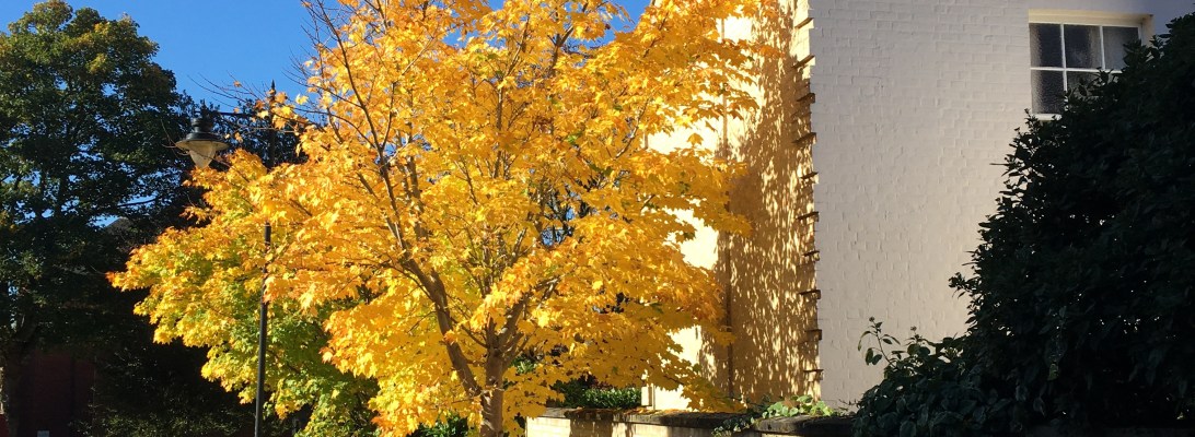 Today: Bright morning light reflection off delivery office, Roundtree Way: Autumn colours and light, Thomas Wyatt Way: Light filled tree, Phillipa Flowerday Plain: Favourite foliage, Plantsman Close: Exquisite Autumnal leaf, Ipswich Rd.