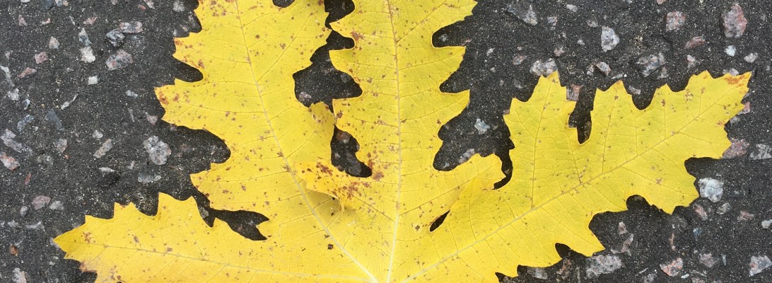 Today: Patterned leaf: Colourful bush: An vertical leaf in Church Avenue, it had fallen tip first and was improbably wedged standing upright.