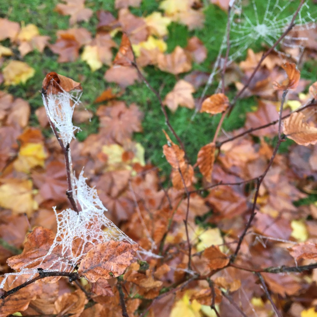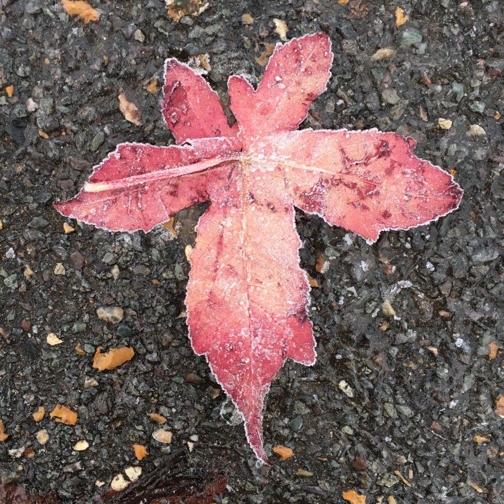 Today: First frost, windscreen of van: Still unable to deliver to no 9 Newmarket Road: A little leaf that floated it’s way into my delivery bag: A favourite bush, Ipswich Road, muting gently into winter.