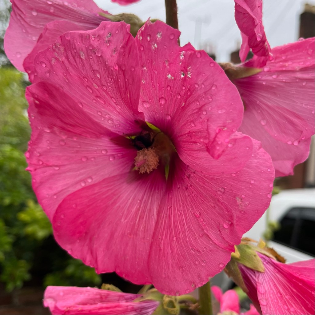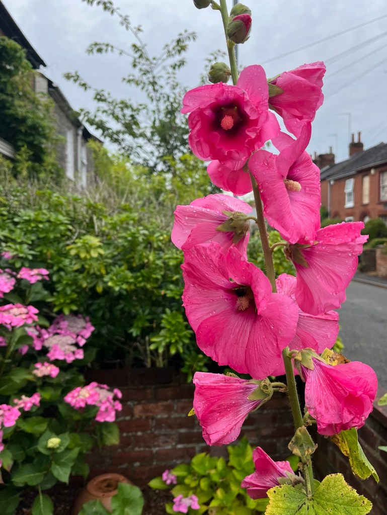 Hollyhocks tower over me in Gladstone Street today, another dry but overcast day in which we manage to get all delivered.