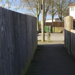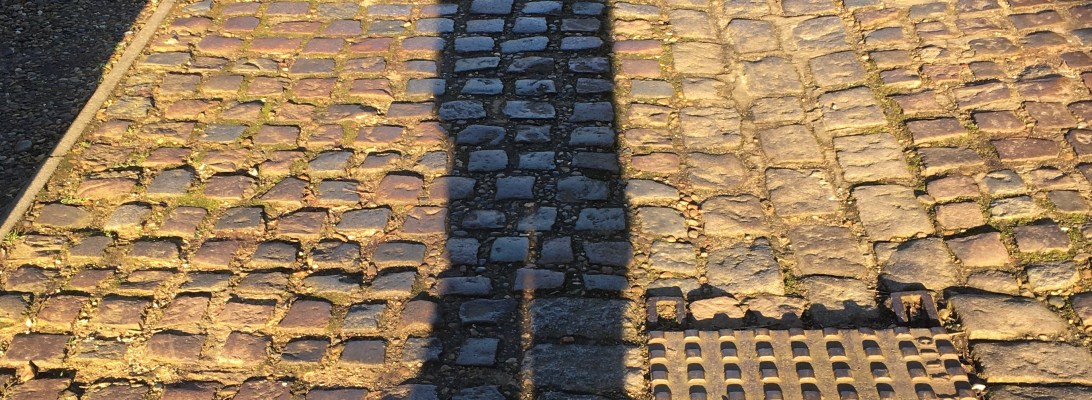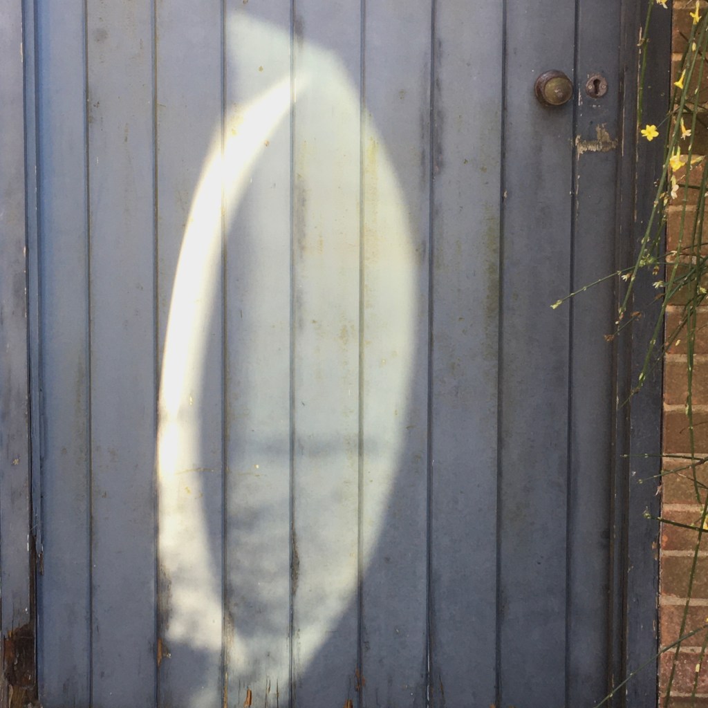 Today: Van as abstract: Extraordinary reflected light pattern on gate, Harford Manor Road: Shadow with blue cobbles, Allen’s Lane